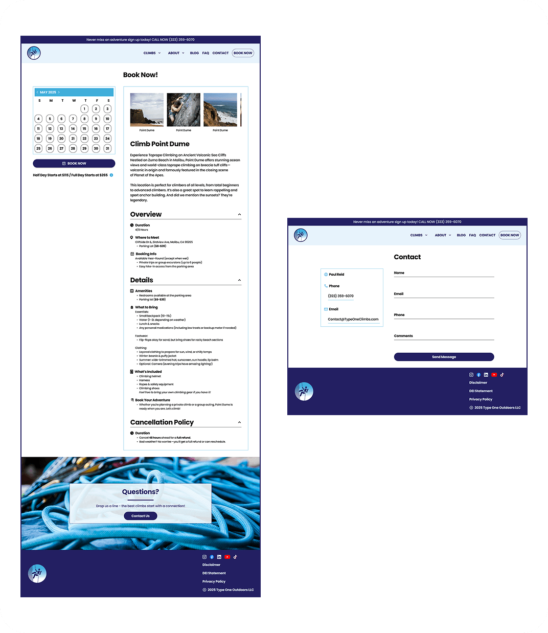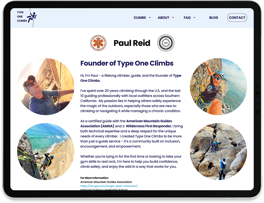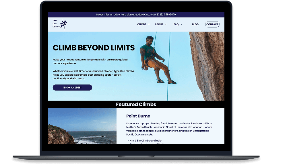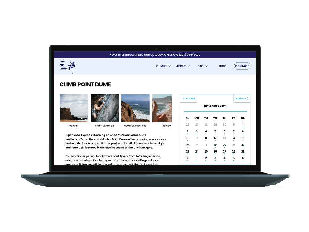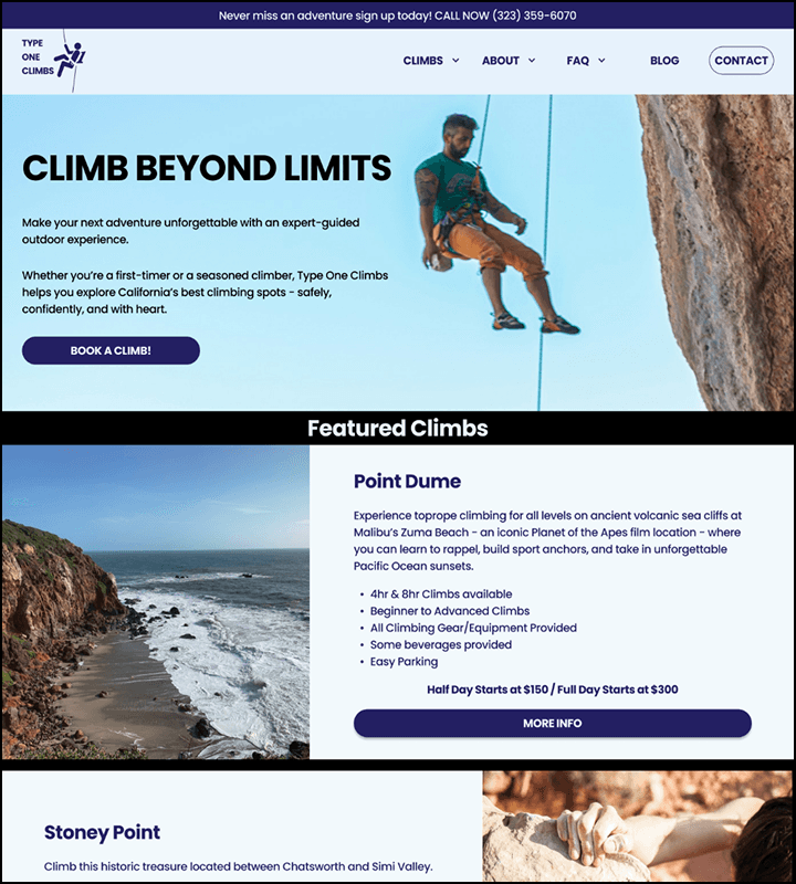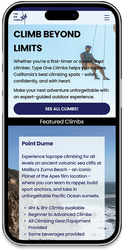 Climbing is built on trust: trust in your rope, your partner, and your guide. The same principle applies when booking guided adventures online. Type One Climbs, a small guiding company in Los Angeles, had a website that felt outdated, hard to navigate, and lacking the credibility that convinces beginners to book.