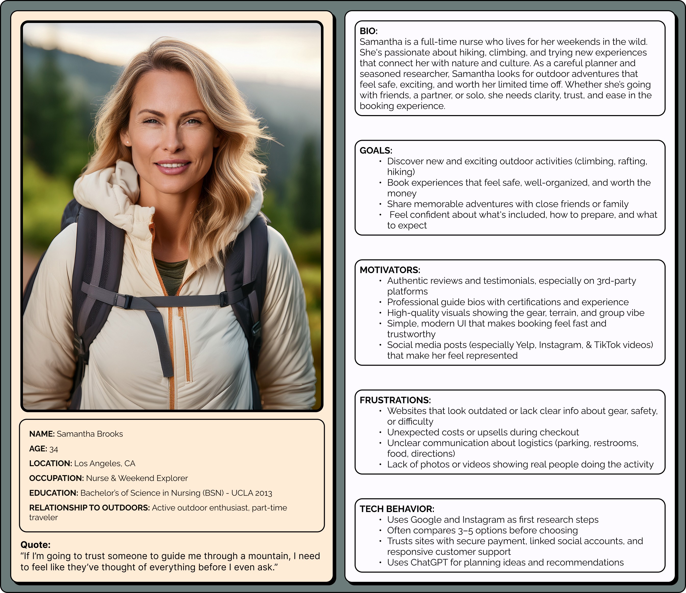 High-quality images gave users confidence that the gear was professional. Clear information architecture made them feel the company was organized. Even small changes in wording signaled whether they were in good hands. I saw firsthand how design decisions that might seem cosmetic can make or break someone’s willingness to book an adventure that feels risky or unfamiliar.