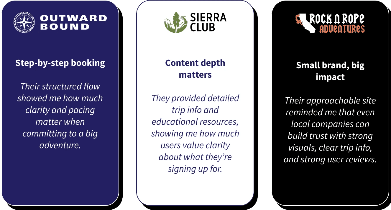 I used these lessons to prioritize features like clear booking flows, visible certifications, beginner resources, and strong visuals in my redesign.