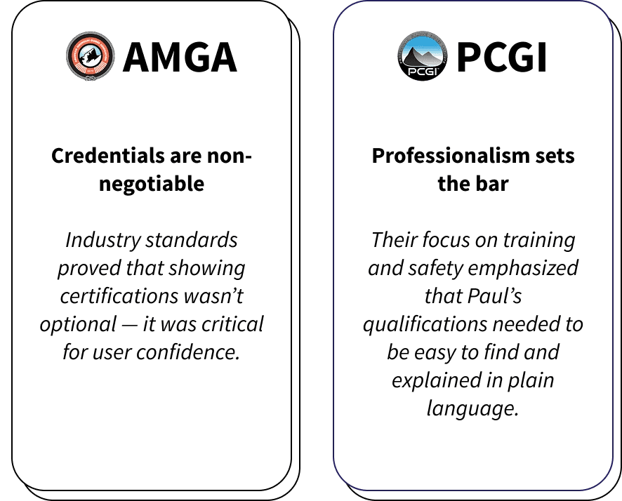 To better understand how credibility is built in the outdoor guiding industry, I analyzed five competitor websites ranging from large organizations like Outward Bound to smaller local outfitters. I also reviewed safety standards from AMGA (American Mountain Guides Association) and PCGI (Professional Climbing Guides Institute) to see what signals users expect from professional guides.